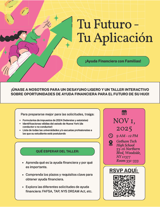 Join is on Saturday, November 1, 2025 from 9AM to 12PM at Gotham Tech for a light breakfast and interactive workshop on financial aid opportunities for your child's future!